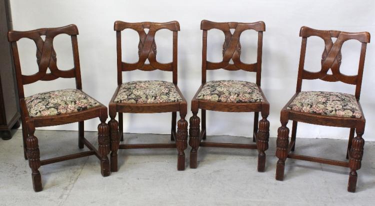Lot 45 of 725: A 1930s oak draw-leaf table on carved bulbous supports, width 90cm and a set of four bow-backed oak chairs with drop-in seats, supported on carved bulbous front legs united by an H-stretcher (5).