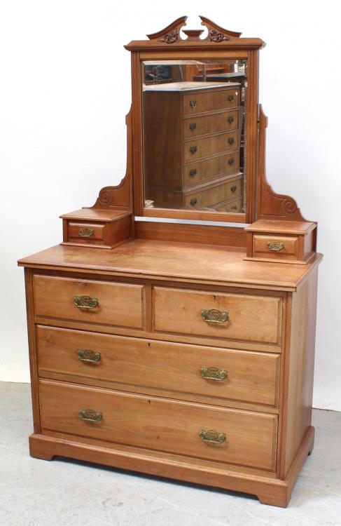 Lot 74 of 725: A late 19th century Aesthetics walnut dressing chest with bevelled rectangular swing mirror supported on twin jewellery boxes, above a two-over-two drawer chest on plinth base, height 173.5cm.