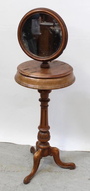 Lot 76 of 725: A Victorian walnut shaving stand with adjustable circular mirror above a twin-compartment table shelf, on fluted column tripartite base, height 128cm.