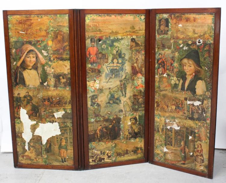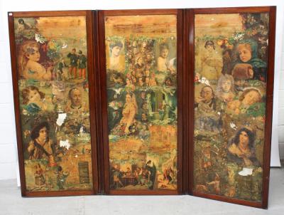 Lot 77 of 725: A Victorian three-fold decoupage dressing screen with brass hinge fittings, height 163cm.