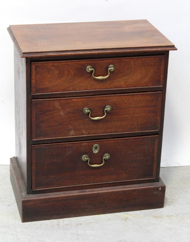 Lot 83 of 725: A small 19th century walnut chest of three drawers on plinth base, height 64.5cm.