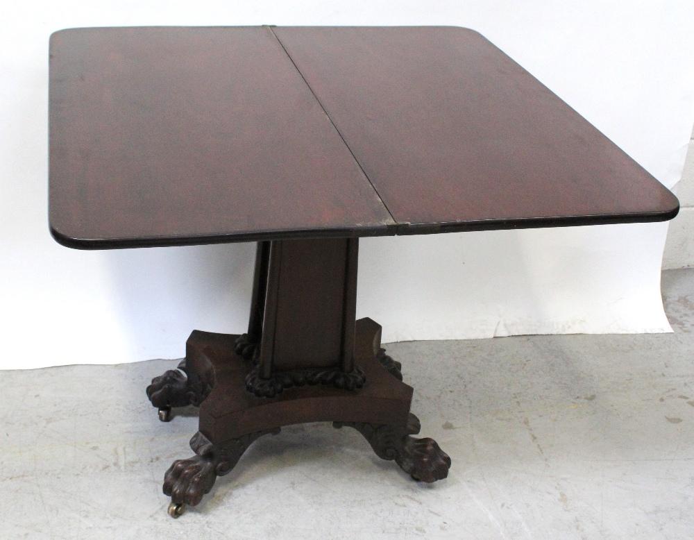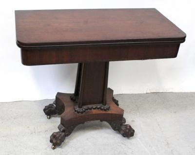 Lot 85 of 725: A William IV mahogany fold-over card table on square column support to platform base on paw feet to brass castors, width 89cm.