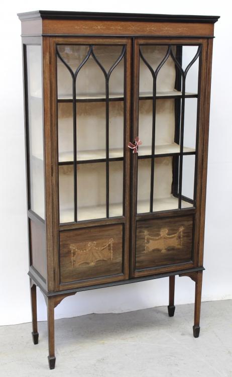 Lot 98 of 725: An Edwardian mahogany inlaid display cabinet with two astragal glazed doors to lower panels with bow and swag inlay to tapering supports to peg feet, 167 x 87cm.