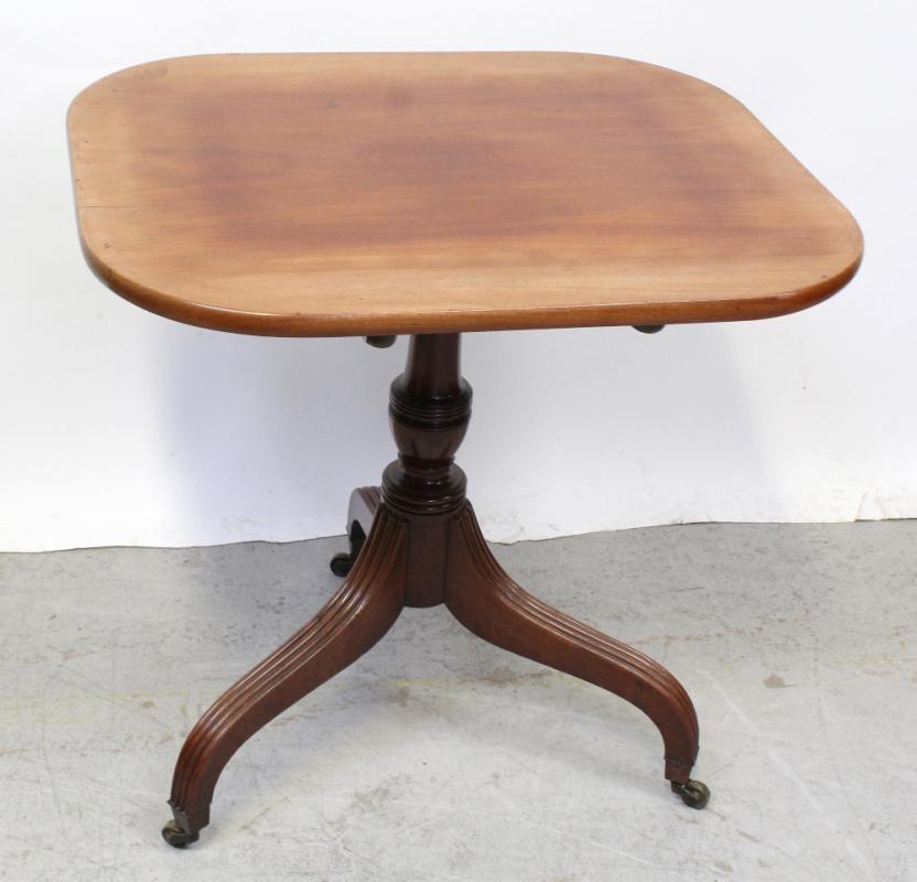 Lot 100 of 725: An early 20th century mahogany tilt-top table on column support to tripartite outswept supports to castors, 62 x 62cm.