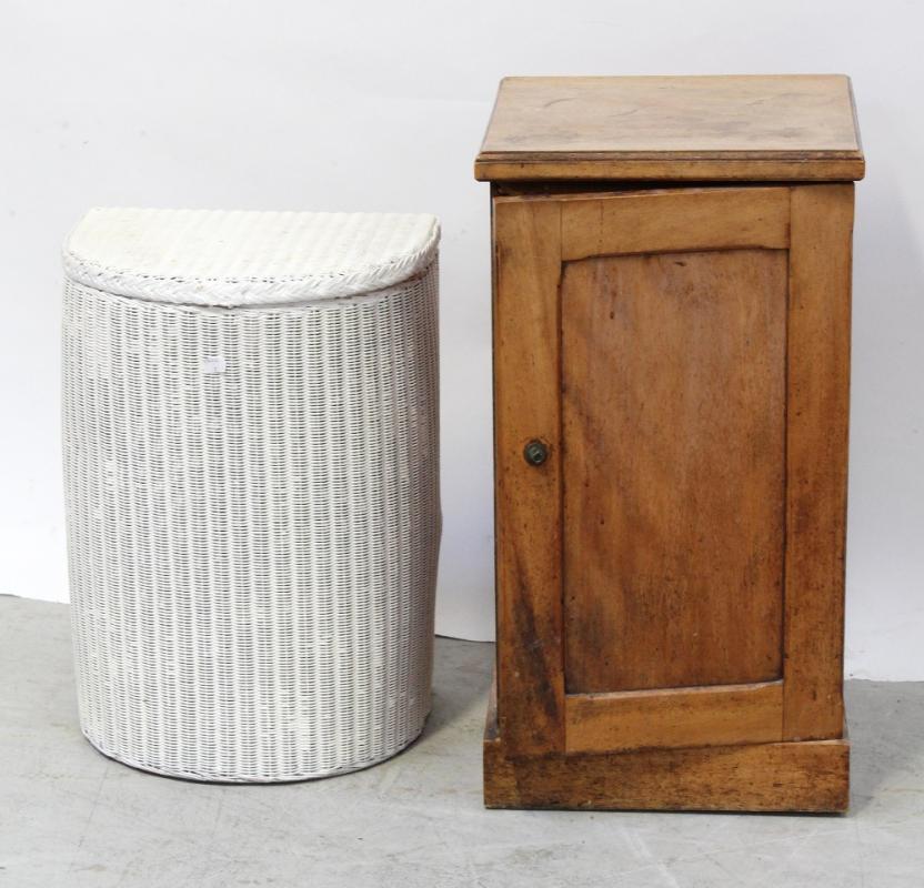 Lot 102 of 725: An Edwardian pot/bedside cabinet, panel door to plinth base, 69 x 36cm and a white painted Lloyd Loom style linen basket (2).