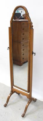 Lot 103 of 725: An Edwardian 'Rumney & Love, Liverpool' two-drawer side table on turned supports to castors, length 102cm and an Edwardian mahogany cheval mirror with curved arched top with urn decoration to side supports, to side pillars to outswept supports, length 159cm (2).