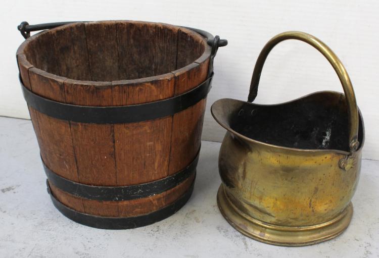 Lot 109 of 725: An early 20th century coopered oak log bucket, height 31cm and a brass helmet-shaped coal scuttle (2).