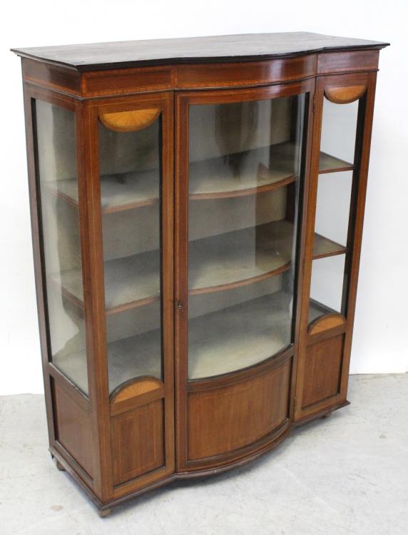 Lot 115 of 725: An early 20th century mahogany bow-front inlaid display cabinet, central bow-front glass door, glass panels to either side, two interior curved shelves, three lower inlaid panels on plinth and ball support, 133 x 105cm.