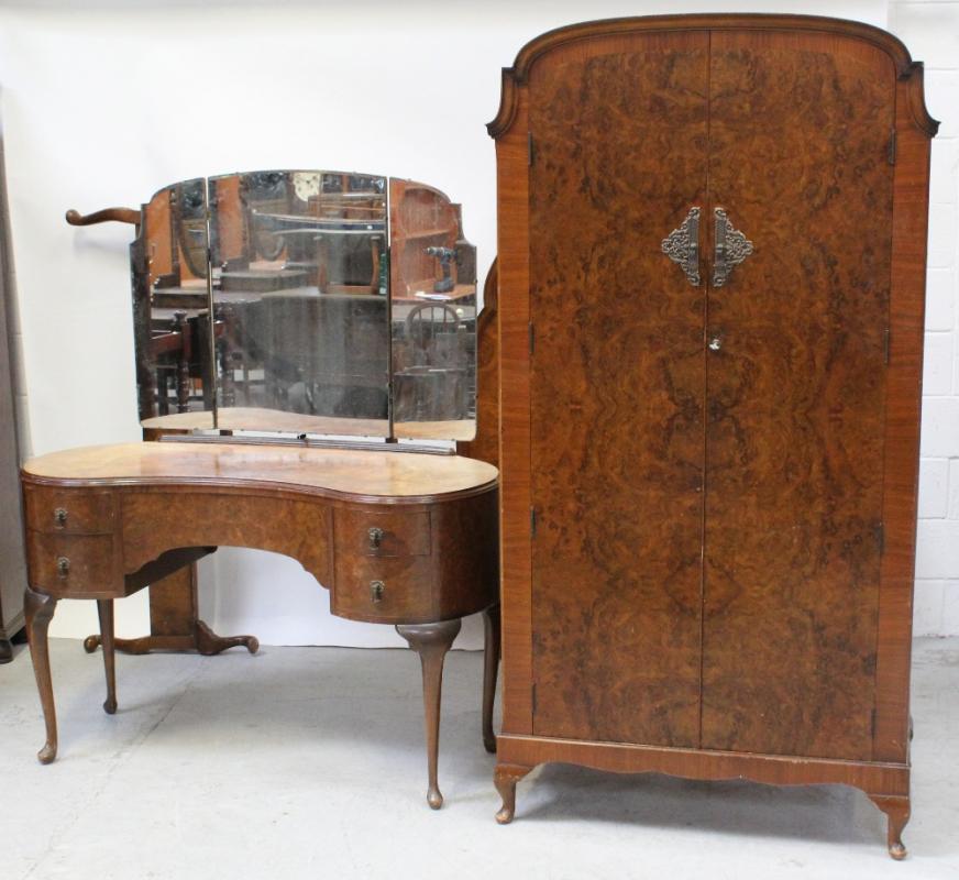Lot 117 of 725: A 1950s walnut bachelor's wardrobe cross-banded in walnut, height 182.5cm, a walnut kidney-shaped 1930s dressing table with triptych mirror and a similar walnut bed frame with bed irons (3).