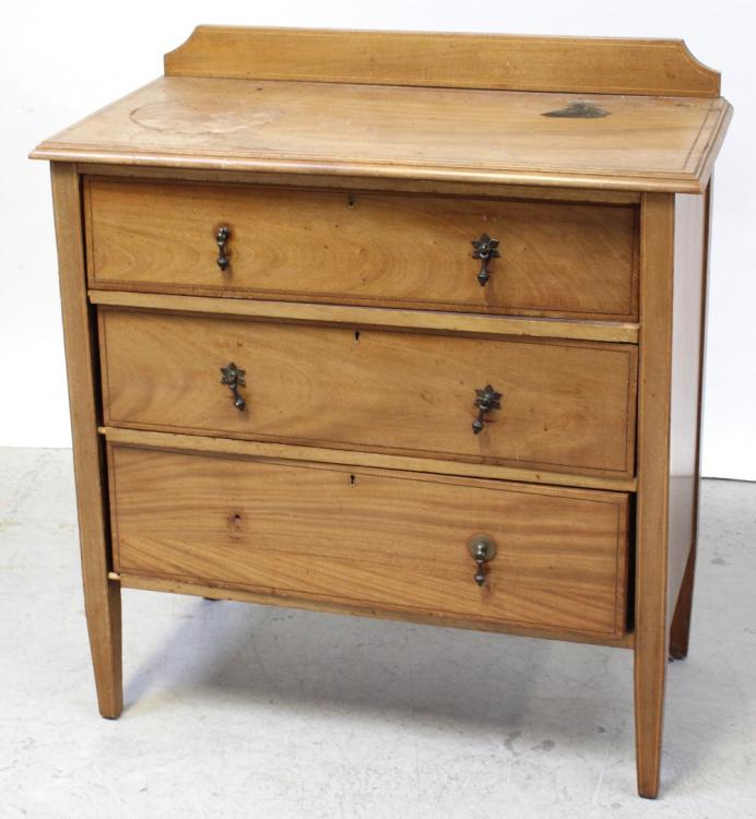 Lot 118 of 725: An Edwardian line-inlaid walnut chest of three drawers on square tapering legs (af), height 101cm.