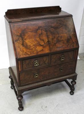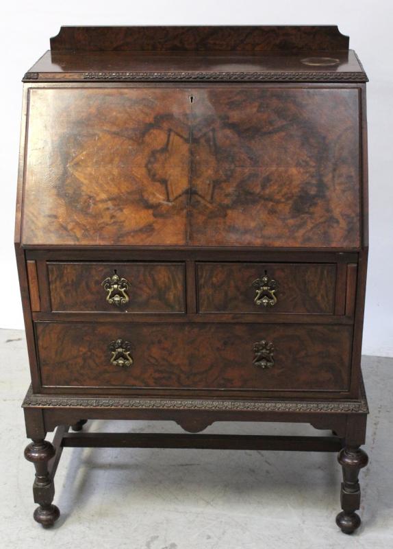 Lot 121 of 725: A 1930s walnut bureau with quarter match veneered fall with fitted interior, over two frieze drawers and one long drawer, all supported on turned legs united by an H-stretcher, height 114cm.