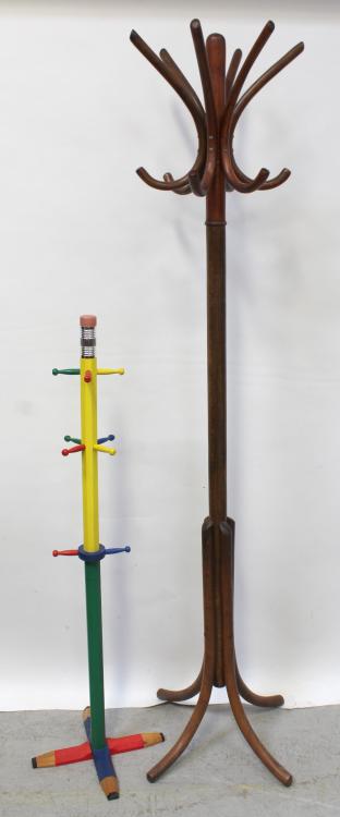 Lot 127 of 725: A 1930s steam-bent beech coat and hat stand, height 186cm and a smaller novelty children's coat stand in the form of a pencil (2).