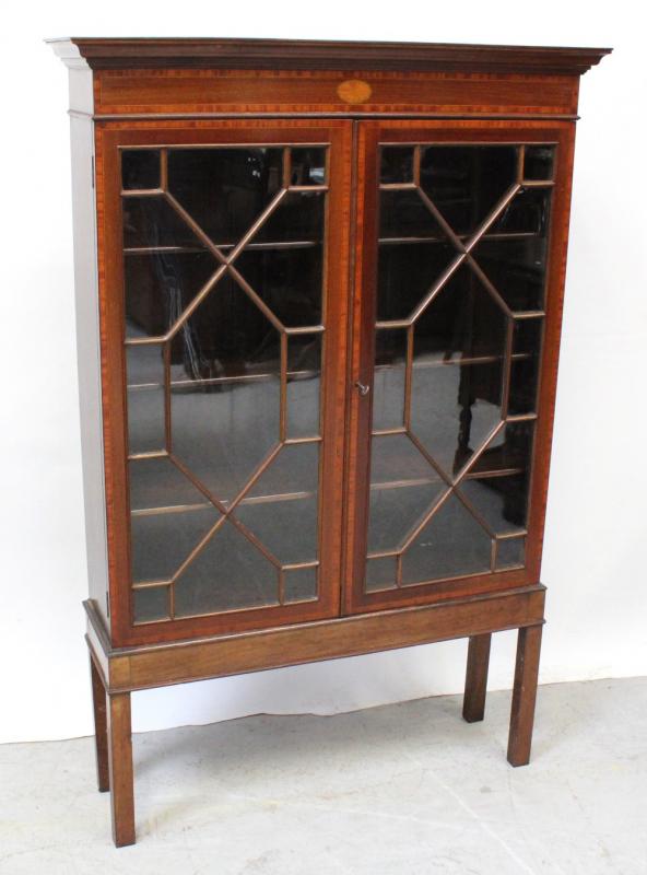 Lot 128 of 725: An Edwardian mahogany and satinwood inlaid elevated bookcase with astragal glazed doors, supported on square legs, height 147cm.