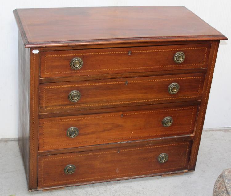 Lot 134 of 725: An Edwardian chevron line-inlaid mahogany chest of four drawers (af), approx height 77cm.