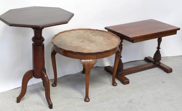 Lot 137 of 725: A 1930s burr walnut quarter-match veneer piecrust-edge table with cabriole legs to pad feet, a mahogany twin-pillar coffee table and an octagonal pedestal table on tripartite legs, approx height 75cm (3).