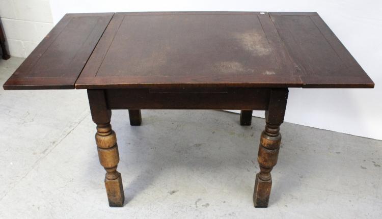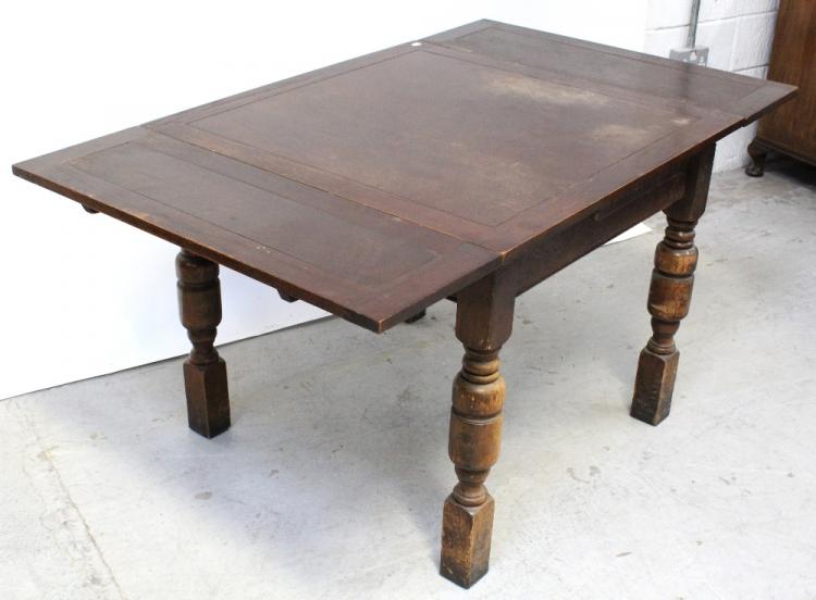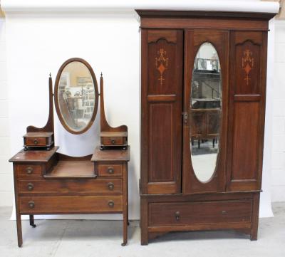 Lot 138 of 725: An Edwardian mahogany single wardrobe, the central oval mirrored door flanked by marquetry panels over a single-drawer base, height 197.5cm, a matching dressing table and a 1930s oak draw-leaf table with two pull-out leaves supported on baluster turned legs to square feet, width 91.5cm (3).
