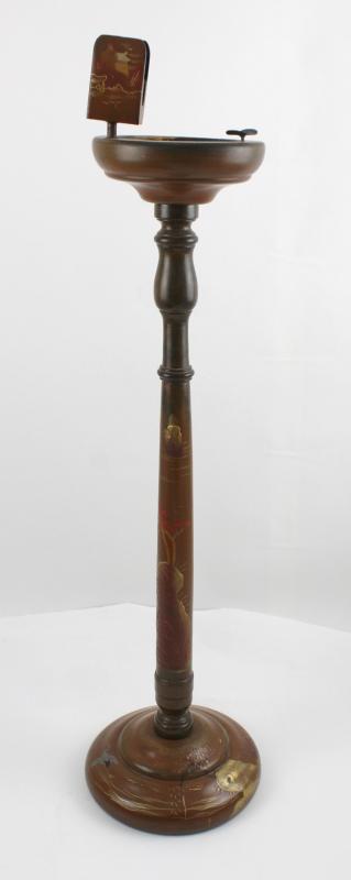 Lot 140 of 725: A 1930s Japanese lacquer smoking companion with match clip, cigar rest, on turned column support with figural decoration, height 74cm.
