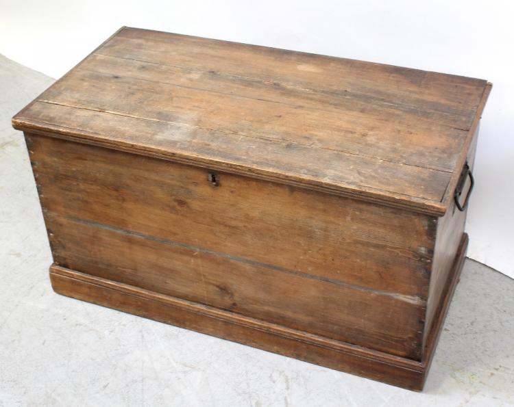 Lot 142 of 725: An early 20th century dovetail pine blanket box with candle box and wrought iron ring handles, width 89cm.