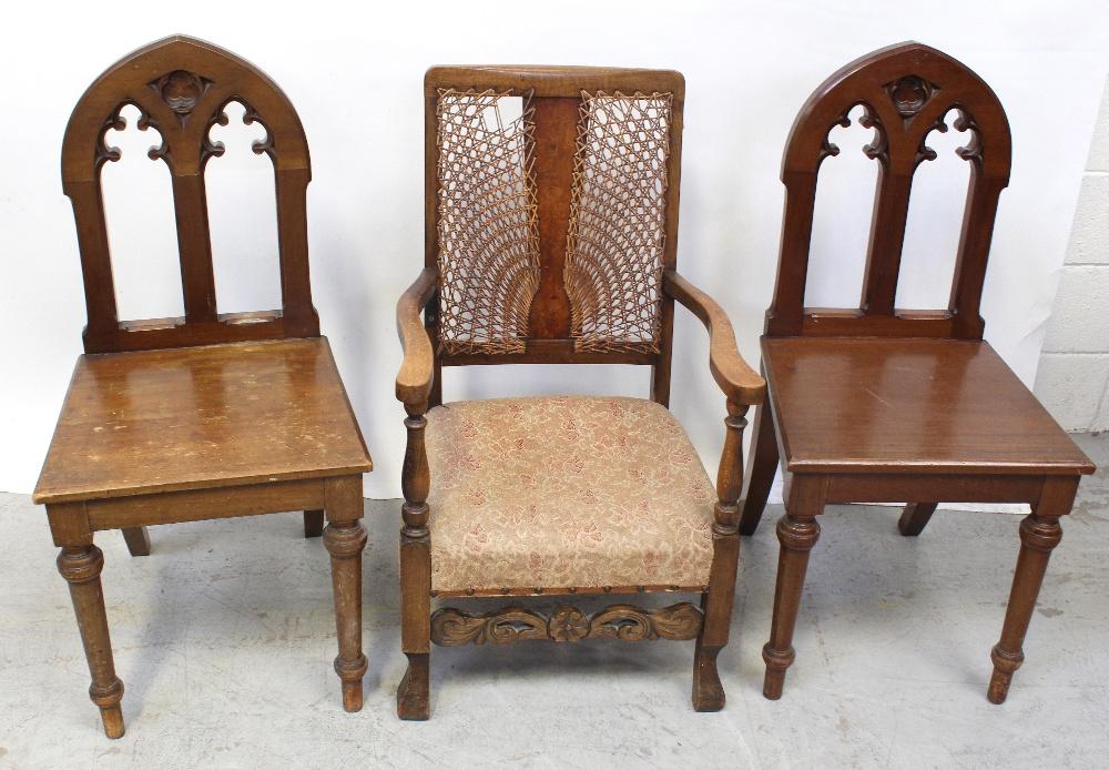 Lot 149 of 725: Two Edwardian mahogany non-matching hall chairs and one bergère armchair (3).