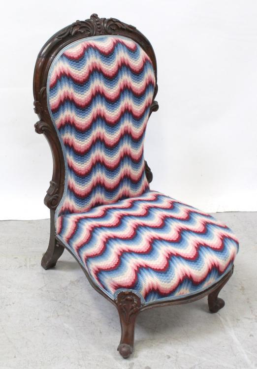 Lot 153 of 725: A Victorian walnut spoon-back fireside chair with acanthus carved cartouche, supported on carved cabriole legs to scroll feet, upholstered in wool tapestry cover, height 100.5cm.