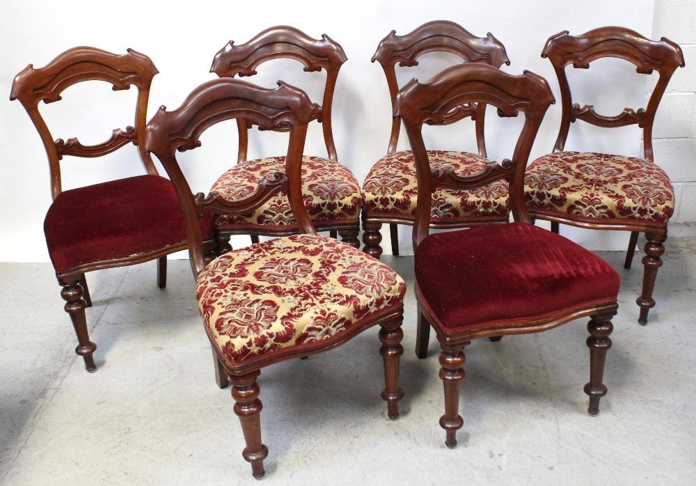 Lot 155 of 725: A set of six Victorian mahogany balloon-back dining chairs with curved top rails to turned baluster supports and peg feet (6).