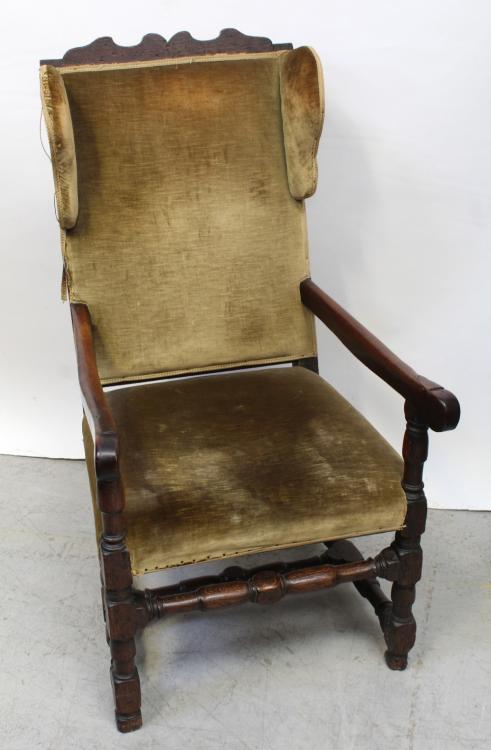 Lot 157 of 725: An 18th century oak and fruitwood wing armchair with shaped top rail and upholstered back above a stuff-over seat with fruitwood arms supported on a turned and square oak frame united by a front stretcher and H-stretcher, approx height 117cm.