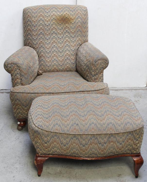 Lot 158 of 725: An early 20th century upholstered armchair with scroll arms, turned legs and shepherd castors, height 86.5cm and a cabriole leg stool finished in the same fabric (2).