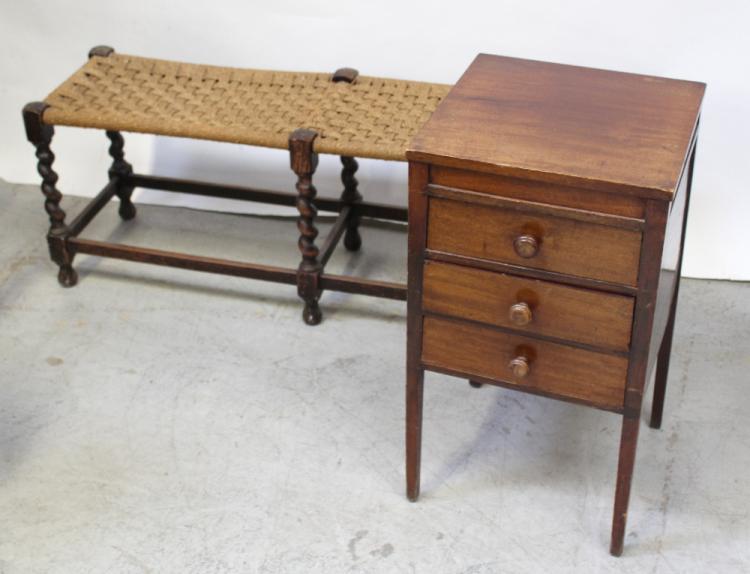 Lot 160 of 725: A 1930s stained oak barleytwist long stool with raffia work seat, width 122cn and a small mahogany bedside chest of three drawers on square tapering legs (2).