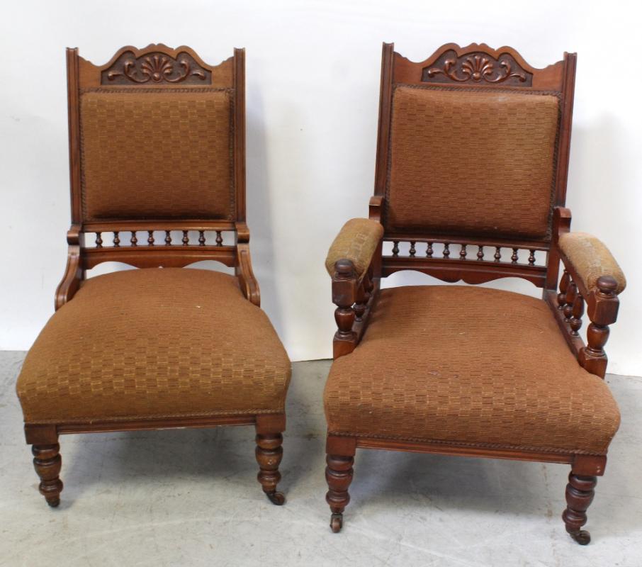 Lot 163 of 725: A pair of Victorian walnut 'His and Hers' fireside chairs upholstered in brown coarse weave fabric, on turned legs to porcelain castors, height approx 100cm (2).