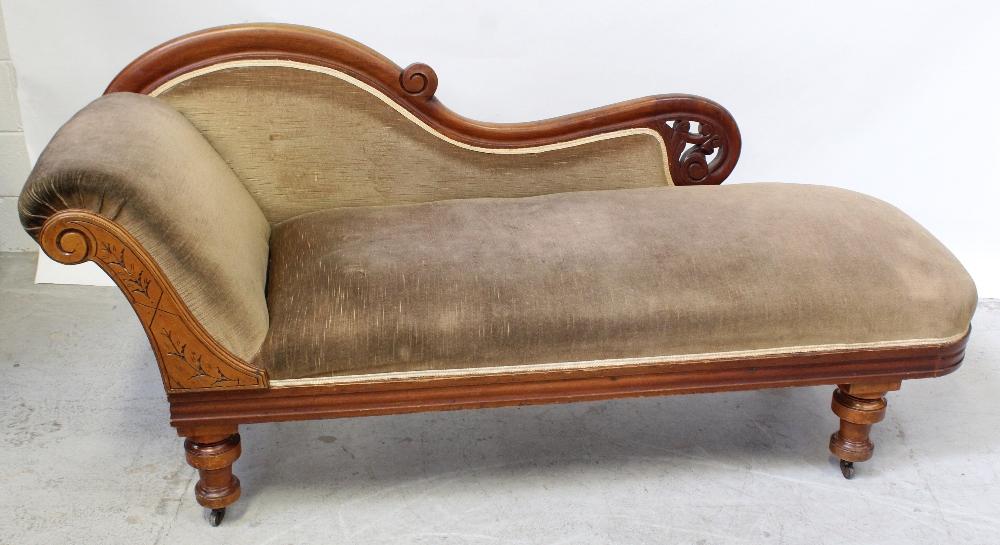 Lot 165 of 725: A late 19th century Aesthetics walnut chaise longue with swept back supports, supported on turned legs to metal castors, approx width 180cm.