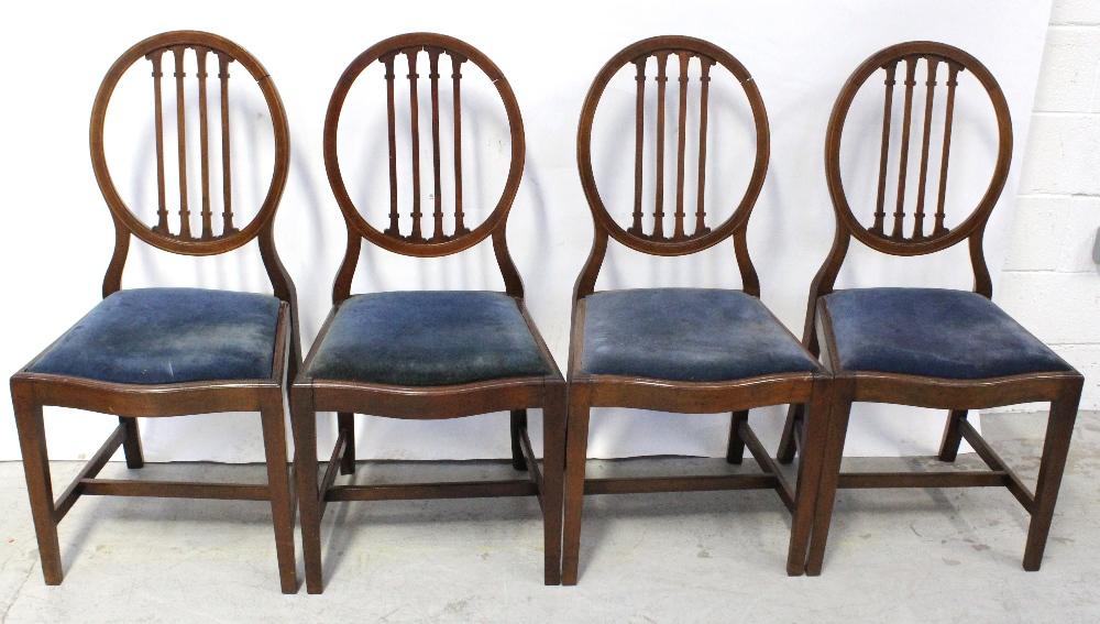 Lot 169 of 725: A set of four Edwardian inlaid mahogany dining chairs, oval backs with four Classical inlaid columns, to tapering supports (af) (4).