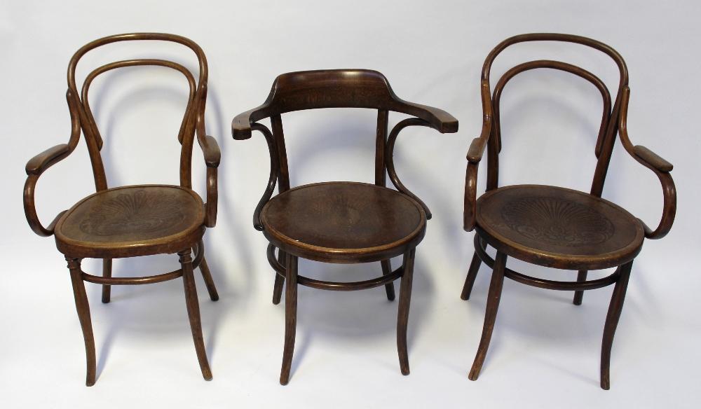 Lot 170 of 725: Three Thonet-style bentwood non-matching chairs, to include an example with rectangular seat, a circular seat and one in the style of a captain's chair (3).