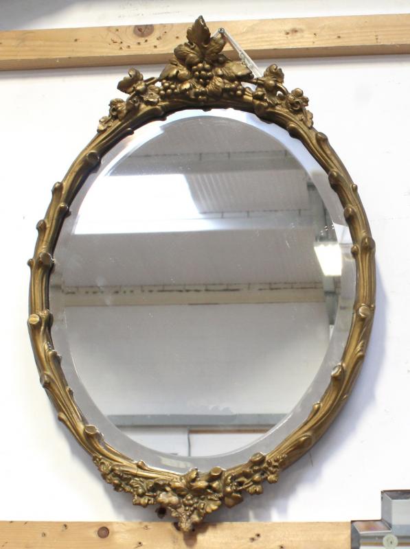 Lot 171 of 725: An early 20th century oval bevel-edge wall mirror with ornate gilded frame of faux bamboo, vine and grape decoration, length 52cm.