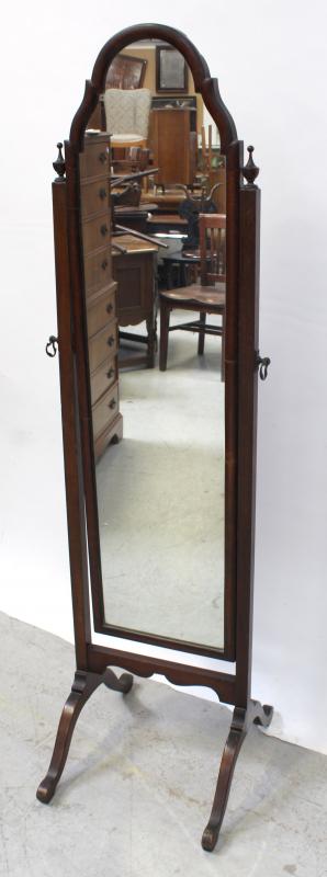 Lot 172 of 725: A mahogany arched-top cheval mirror on square supports capped by turned finials, height 159.5cm.