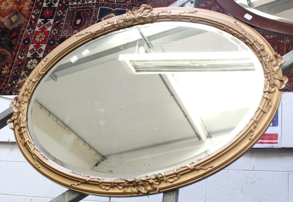 Lot 176 of 725: A contemporary oval bevel-edge wall mirror with gold painted ornate frame decorated with bows and swags, length 94cm.