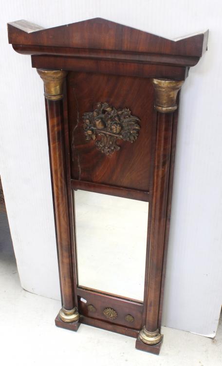 Lot 178 of 725: A Regency walnut narrow pier mirror with looking glass and gesso cornucopia decorated panel flanked by twin gilt capital pilaster columns over an applied gilt decorated lower frieze, approx height 103cm.