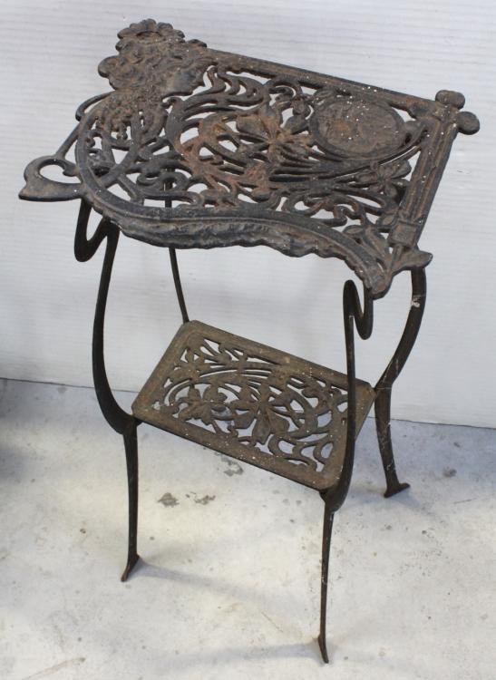 Lot 181 of 725: A small Art Nouveau style cast iron garden architectural jardinière stand decorated with female bust in profile facing dexter, decorated with whiplash curves on shaped legs united by a shelf stretcher height 72cm.