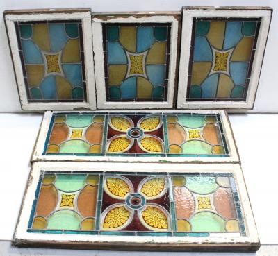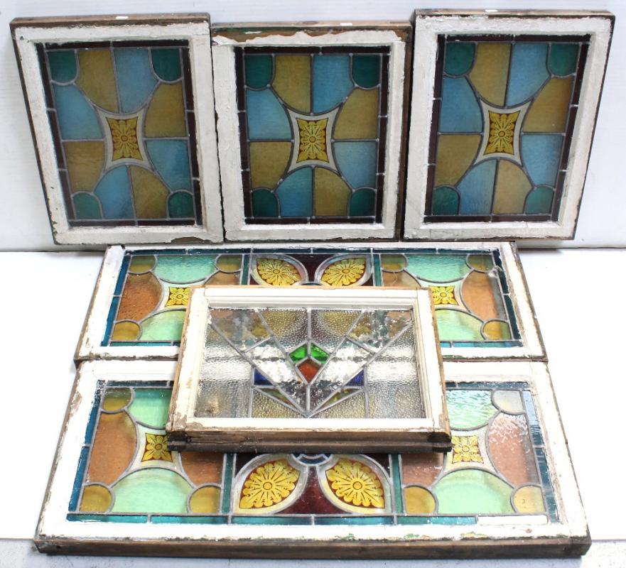Lot 182 of 725: A group of vintage stained glass windows to include two large rectangular matching panels, approx height 100cm, three smaller matching panels and a 1930s Art Deco stained glass window (6).