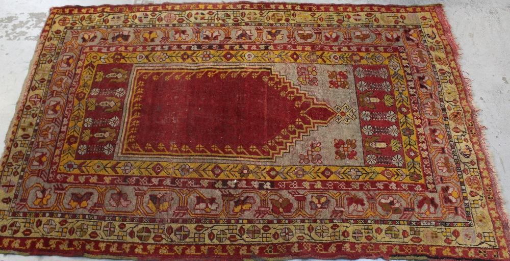 Lot 195 of 725: A tribal hand-knotted Caucasian red ground carpet with mihrab decoration to the centre within a stylised geometric multi-border, approx 162 x 101cm.