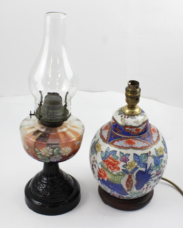 Lot 202 of 725: An early-to-mid 20th century oil lamp with floral painted reserve, height 44cm and an Oriental ginger jar on hardwood stand, converted to a lamp, height 23cm (2).