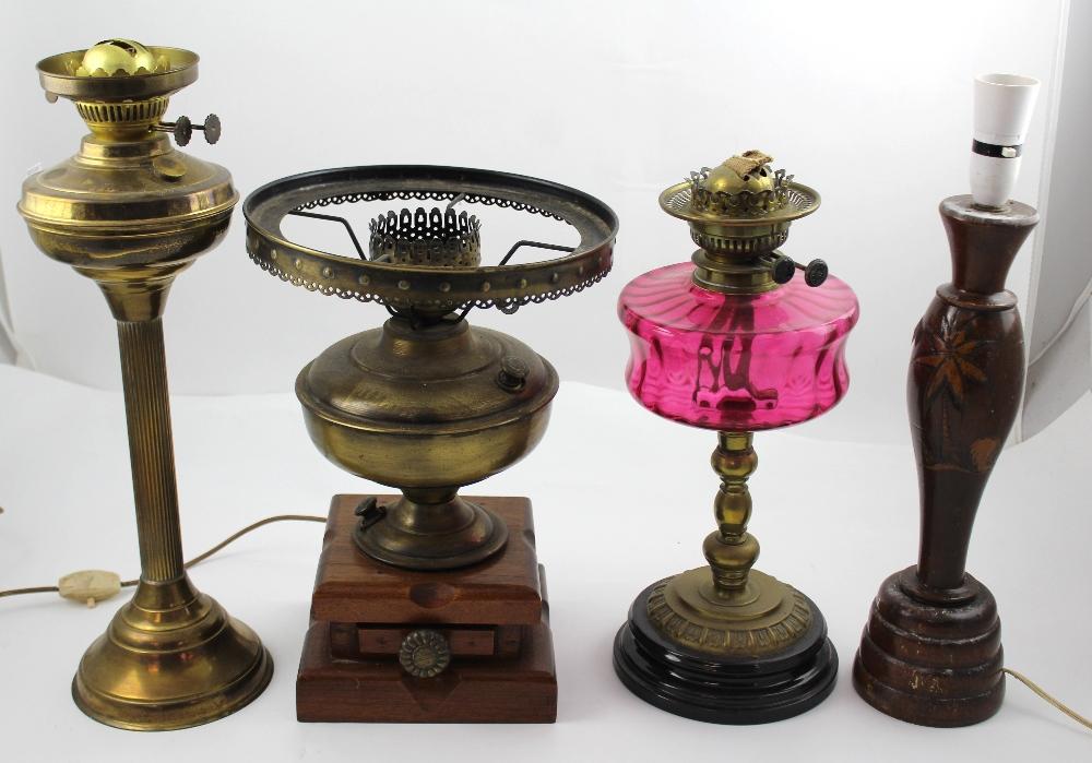 Lot 203 of 725: Three vintage paraffin lamps to include a large brass example with reeded column, height 48.5cm, a brass example with cranberry glass reservoir on black socle base, a brass wide shade reproduction electric lamp, on wooden base and a wooden carved lamp base with palm tree decoration (4).