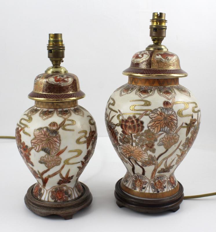 Lot 206 of 725: Two Oriental-style baluster table lamps with floral and foliate decoration of chrysanthemums and peonies, gilt-heightened, on an Oriental hardwood base, height of largest 35cm (2).