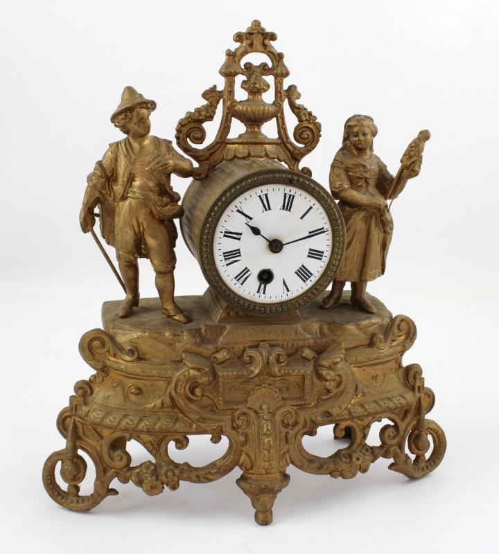 Lot 217 of 725: A French gilt style mantel clock with drum movement, the dial set with Roman numerals flanked by figures, on scrolling Rococo base, height 32cm.