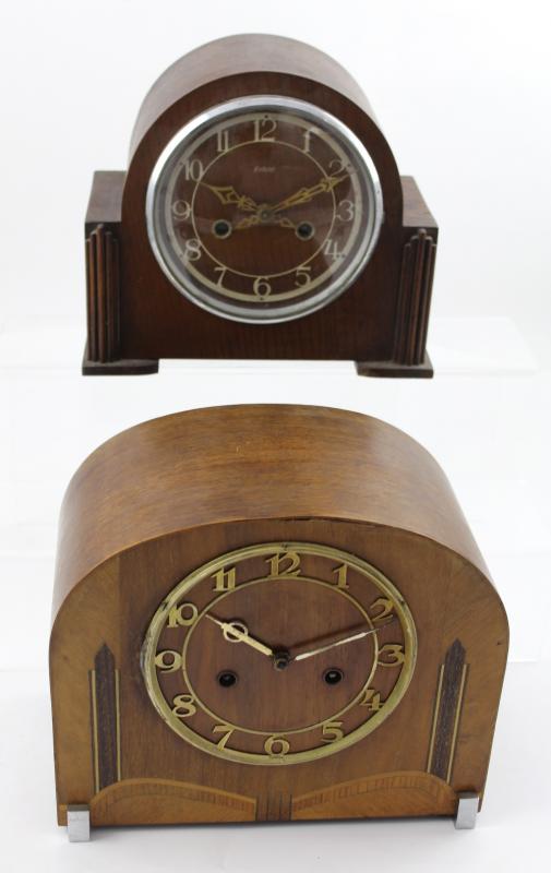 Lot 221 of 725: An Art Deco oak Enfield mantel clock, the dial set with Arabic numerals and striking on coiled rod and an Art Deco walnut example, height 23cm (2).