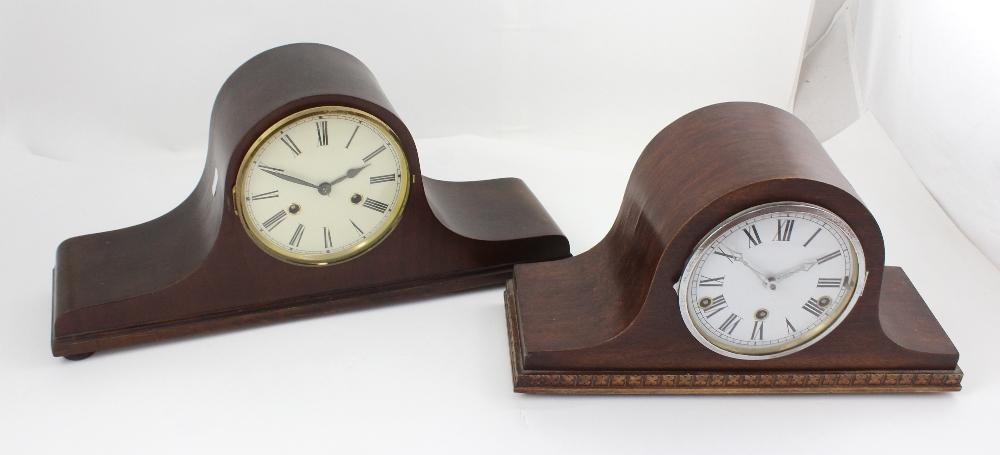 Lot 222 of 725: Two 20th century mahogany-cased eight-day Napoleon hat clocks, one with white ceramic dial set with Roman numerals and floral carved border to base, the other with cream dial set with Roman numerals, largest 23 x 50cm (2).