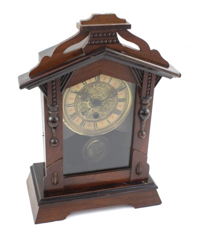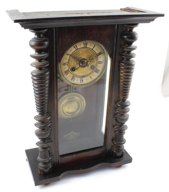 Lot 223 of 725: A late 19th century walnut mantel clock and a stained beech Vienna-style wall clock, height 51cm, both dials set with Roman numerals (2).
