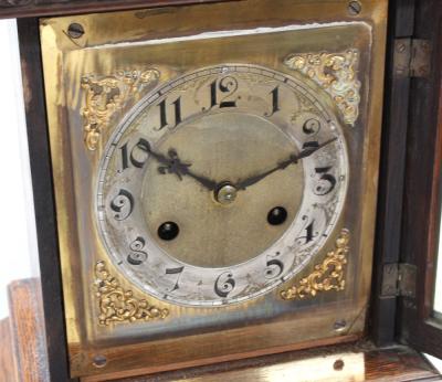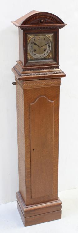 Lot 224 of 725: A 1930s oak bracket clock striking on twin coiled rods, mounted on a later oak plinth, creating the appearance of a short longcase, height 134.5cm.