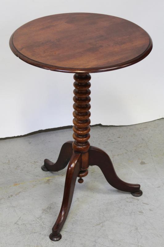 Lot 100A of 725: A 19th century circular tilt-top table on ring-turned column to tripartite outswept supports and pad feet, diameter 50cm.
