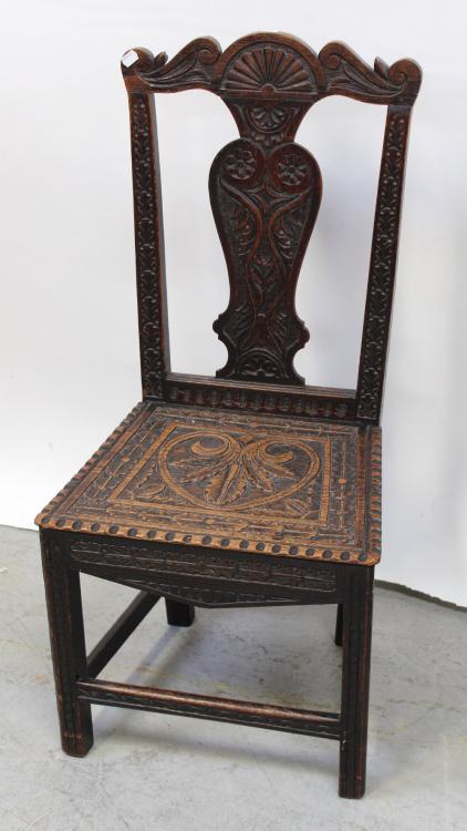Lot 84A of 725: A 19th century carved oak hall chair, curved top rail to splat back, to block supports and cross stretchers, heavily-carved throughout with oak and holly leaves and flora.