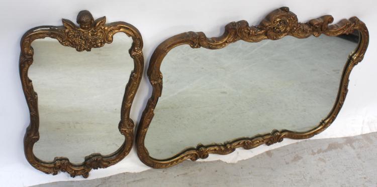 Lot 150A of 725: Two early 20th century gilded ornamental wall mirrors, a rectangular example within a scrolling, floral and shell frame, 47 x 70cm and a smaller example in a scrolling frame with cherub and flora to the top, length 48cm.